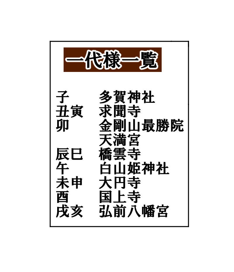 ⑦一代様って何?津軽地方には昔から、一代様信仰という特別な習慣があります。それぞれの人の生まれた年の干支を守り神とした信仰で、生まれた年(=干支)に対して神社仏閣が割り当てられています。ちなみに当宮は戌・亥の一代様です。日本全国で一般的に言われる守り本尊とほぼ同じで、考え方の起源は共通しているようですが、生まれ年によって参拝する神社仏閣が定められている、そして地域全体での伝統的な風習になっているという違いがあるそうです。現在でも子供が生まれた時のお宮参りや、受験・就職などの人生の節目においても自分の一代様にお参りする習慣が続いています。
