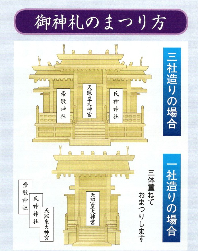 お札のまつり方についてお札は一般的には神棚に納めてお祀りします。住宅事情により設けられない場合は、お札立てなどをご活用頂ければと思います。ここでは宮型の神棚へのお祀りの仕方をご紹介します。扉が三つあり、横に並べてお祀りする三社造りの場合は、中央に伊勢神宮のお札(神宮大麻)、向かって右に氏神様のお札、左に崇敬する神社のお札の順で並べます。扉が一つしかない一社造りの場合は、一番手前に神宮大麻次に氏神様、崇敬する神社の順に重ねてお祀りします。また、神棚自体は明るく清らかで目線より少し上の位置、そして東が南を向くように設置するのが良いとされています。