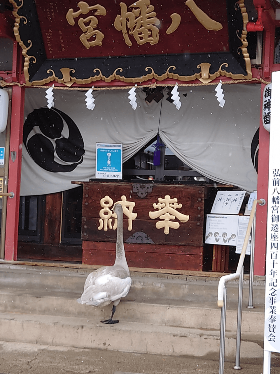 午後3時頃、珍しい方が参拝に訪れました。何かがぶつかるような音が境内から聞こえて来て、そちらを見るとなんと白鳥がおりました。絵馬看板に衝突して落ちたようでしたが、特に目立った外傷は無い様子。体の色から察するに、今年生まれたばかりの子供ではないかとの事でした。群れからはぐれてしまったのでしょうか。