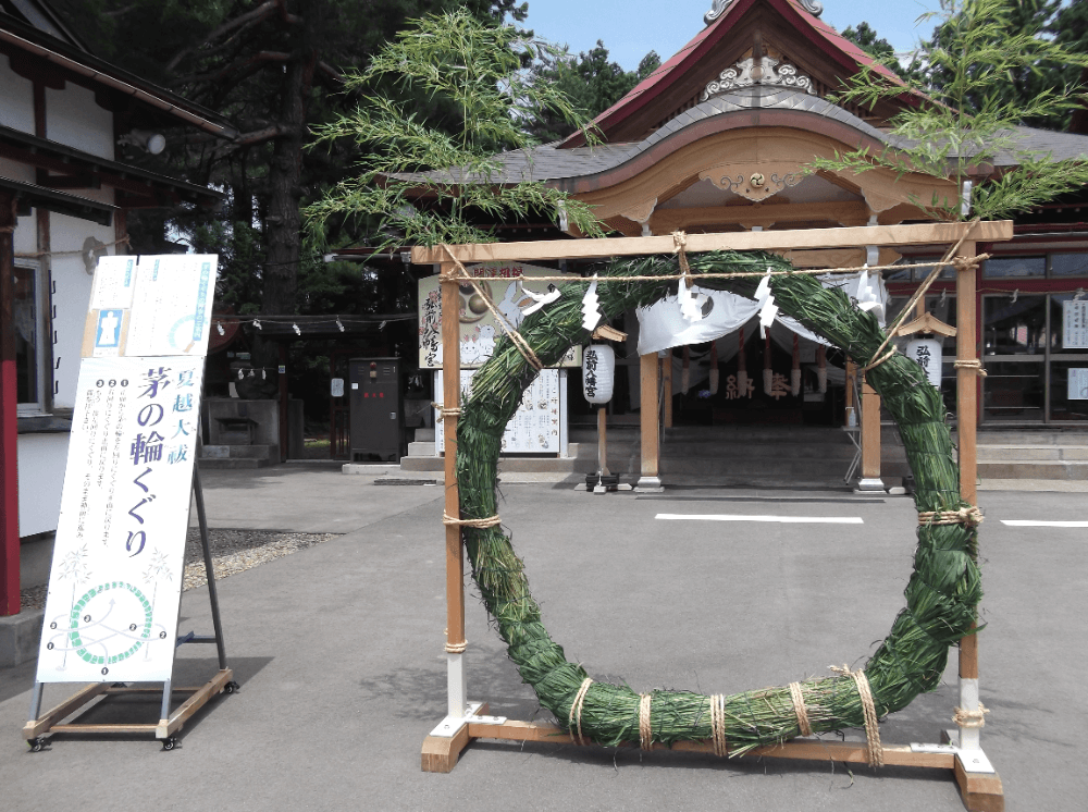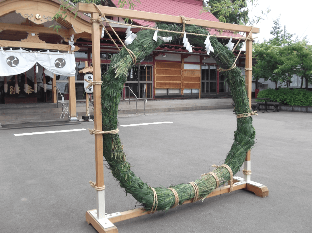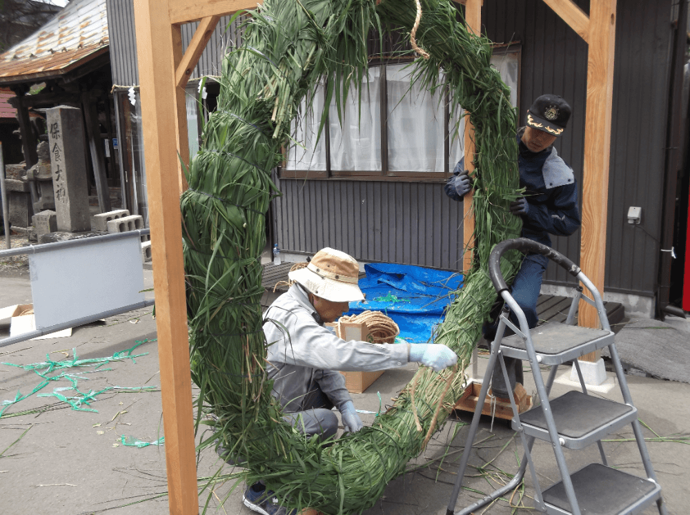 六月三十日に行われる夏越の大祓式では、神事の中で茅の輪をくぐり心身を祓い清めますが、当日お越し頂けない方にもくぐって頂けるようにと早めに茅の輪の制作・設置が行われました。毎年、懇意にして頂いている方の所から茅を刈り取らせて頂き輪に括り付けていきますが、刈り取る所から全て職員が心を込めて行いました。今年はお天気にも恵まれ、暑い位の日差しの中で作業が行われました。六月三十日まで、午前九時~午後四時半まで設置しておりますので、ぜひ皆様で茅の輪くぐりをして頂ければと思います(夏越大祓神事は六月三十日の午後三時より斎行されます)。同時に夏越大祓の特別御朱印も期間限定で頒布しておりますので、ぜひこちらもお求めください。