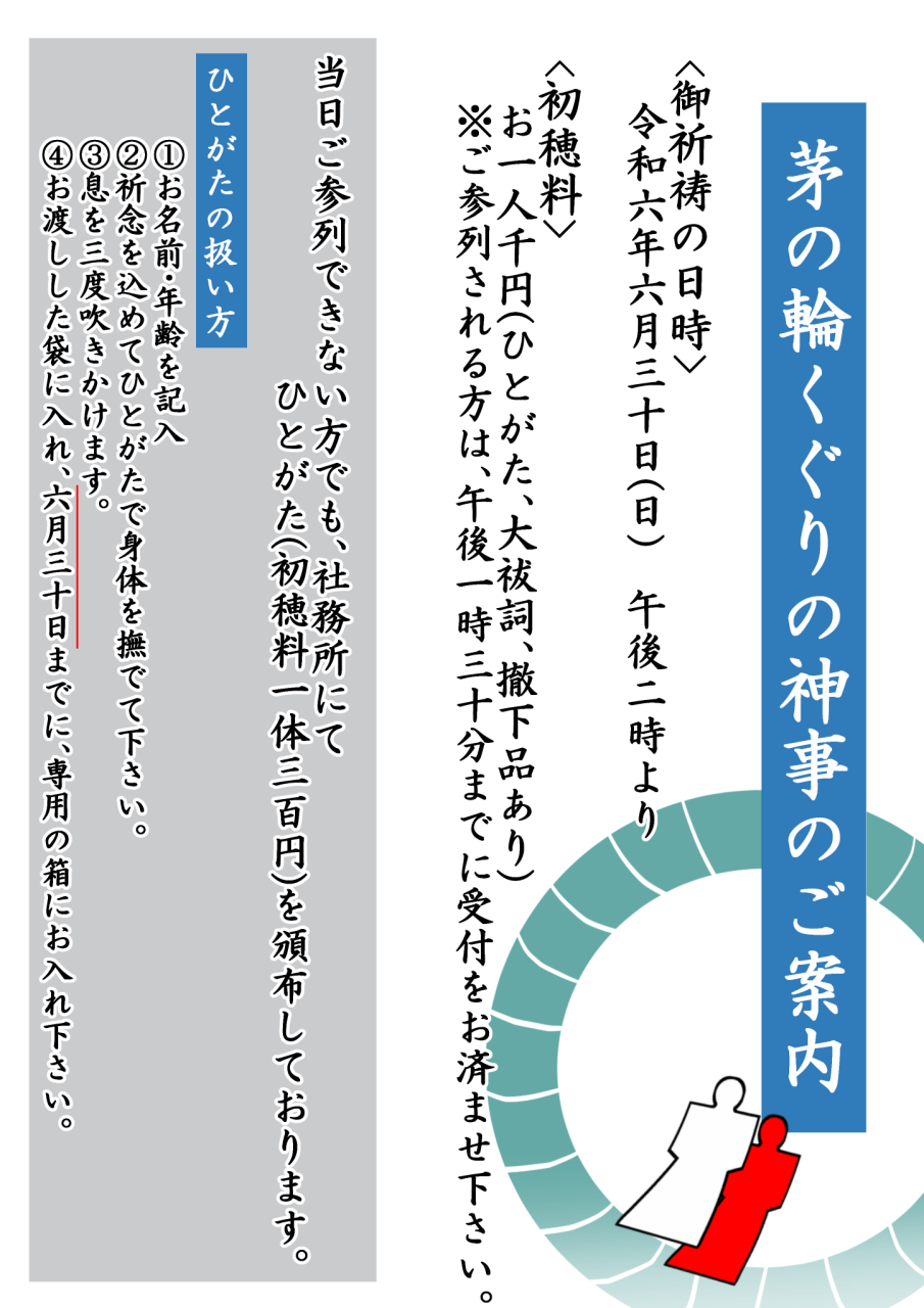 当日、神事にはどなたでも参列頂けます。参列される方はご祈祷料を千円お納め頂きますので、ご用意の上、午後一時三十分までに受付をお済ませください。なお、当日参列出来ない方も、茅の輪は二週間程前から設置しておりますので事前におくぐり頂けます。人形も六月一日から社務所にて頒布しておりますので、どうぞお求めください。